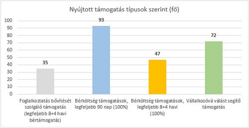 A bértámogatások, bérköltség támogatások nyújtása során összesen 247 ügyfelet helyezett a kormányhivatal foglalkoztatásba, ezen túl 208 munkáltató részesült bér és bérköltség támogatásban. Magas volt a vállalkozóvá válási támogatásban részesültek arány 72 fővel.